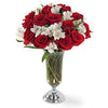 Red roses and alstroemeria are gracefully arranged in our exclusive glass and metal vase. -
