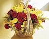 This sweet basket holds a bounty of colorful blooms. Red gerbera daisies are surround by yellow alstroemeria, blue belladonna delphinium, and more! -