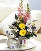 They’ll drink in your gleeful message, as a plush bear hugs a mug full of fresh flowers. Bouquet includes yellow mini gerbera daisies, pink snapdragons, white alstroemeria and more. Perfect for a new baby gift or for anyone who needs a hug.