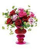 Throw her a romantic curve with this fresh flower bouquet of gorgeous, multi-colored roses in lipstick hues, presented in a modern glass vase that’s shaped like a stack of red and pink bubbles. Fashionable and fun! -