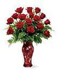 Sixteen glorious long-stemmed red roses are delivered in a gracefully curved crimson glass vase, hand-etched with “heart flowers.” This romantic and impressive flower gift will create a sensation! -